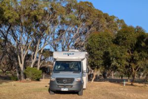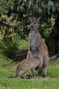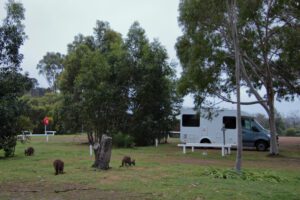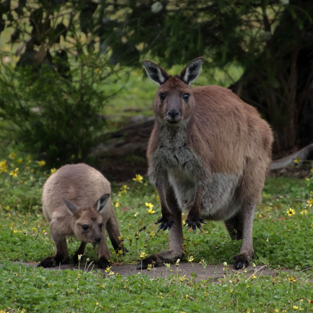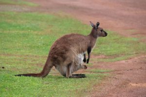 Beim Frühstück konnten wir mehrere Kängurus zwei Stellplätze von uns entfernt beim Futtern beobachten. Eins davon war wieder die Mutter mit dem Joey. Nach dem Frühstück machte ich ein paar Bilder von den Kängurus. Leider war es – wie bei allen unseren bisherigen Känguru-Begegnungen – noch ziemlich dunkel und das trübe Wetter machte es auch nicht besser. Ich hoffe, in den nächsten Tagen noch bessere Bilder von Kängurus machen zu können.