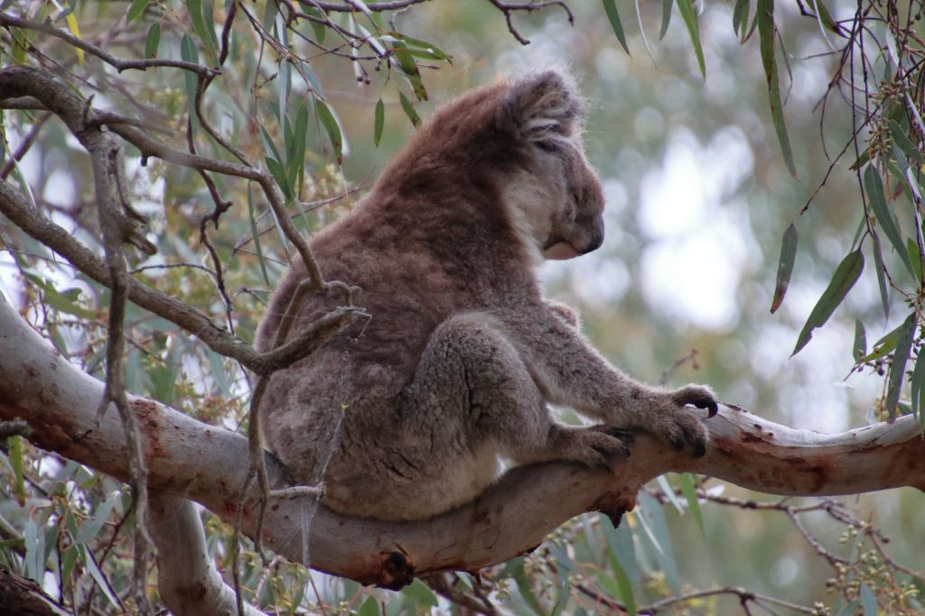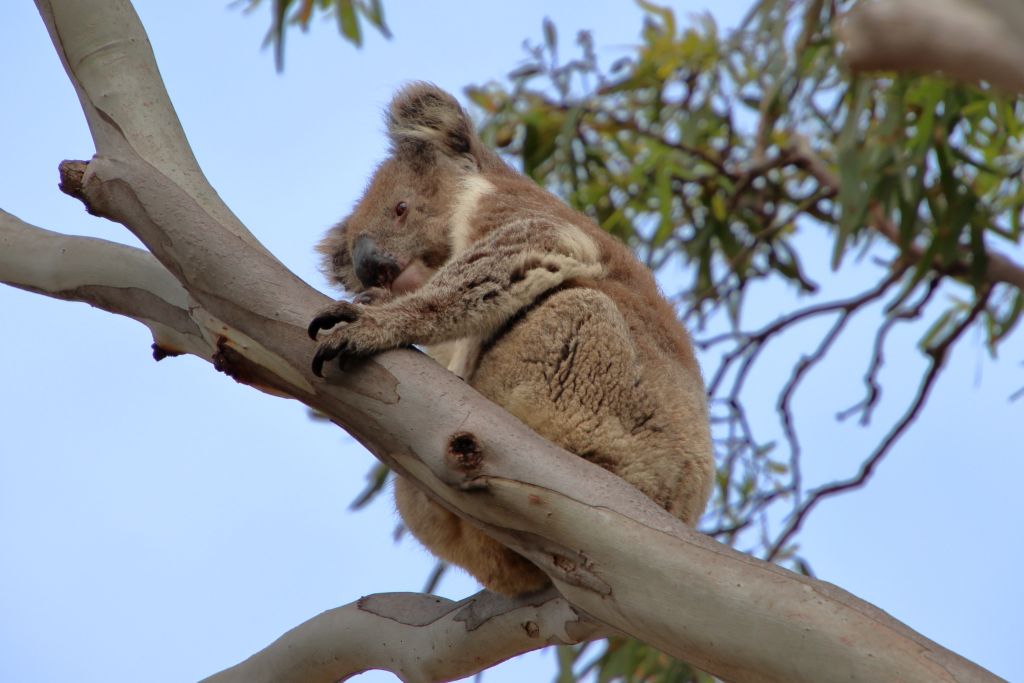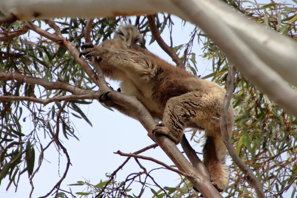 Als wir die Suche nach Koalas schon fast aufgeben wollten, fanden wir doch noch einen an Stellplatz 15. Das war sicher der von Platz 8. Bei der ersten Runde hatten wir dort nicht so genau geschaut, weil die drei Nachbarplätze besetzt waren und wir nicht stören wollten. Der Koala saß erst sehr schön im Baum.