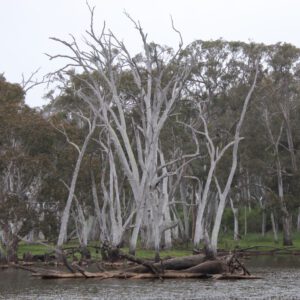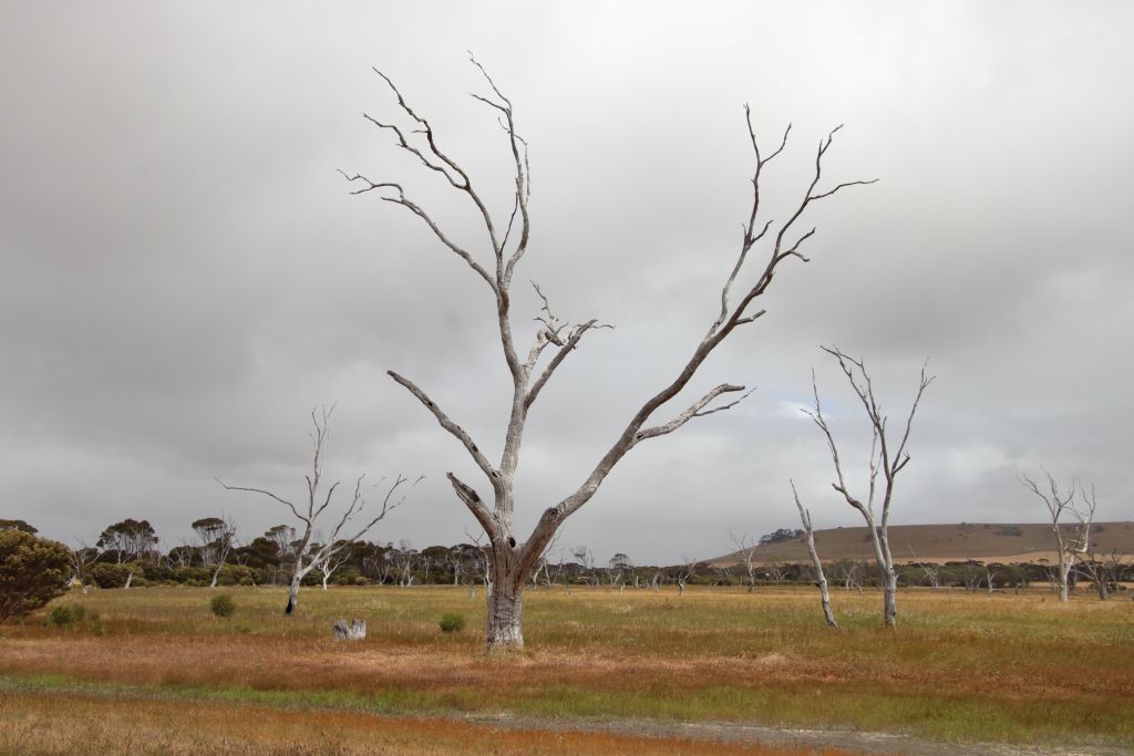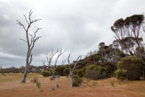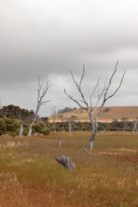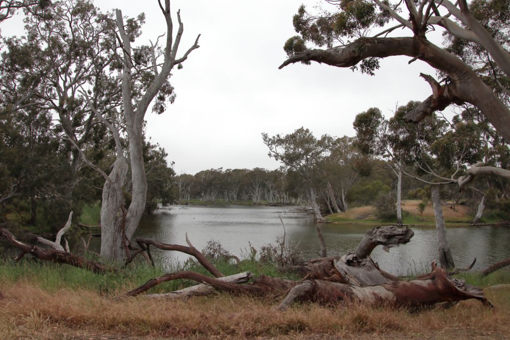 Die Discovery Lagoon ist ausgetrocknet und sah ganz nett aus. Überall standen skurril geformte tote Bäume, die uns ein bisschen an das Dead Vlei in Namibia erinnerten.