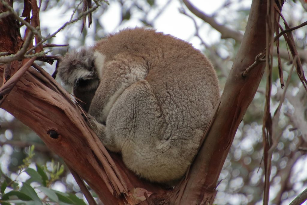 Direkt nach dem Aufwachen prüften wir, ob unsere Koalas noch da waren. Und wir hatten Glück. Anscheinend störte sie unsere Anwesenheit nicht. Sie hatten über Nacht nicht den Baum gewechselt und waren ganz im Gegenteil noch ein Stück näher zu uns geklettert. Sie schliefen ca. fünf Meter über unserer Motorhaube.