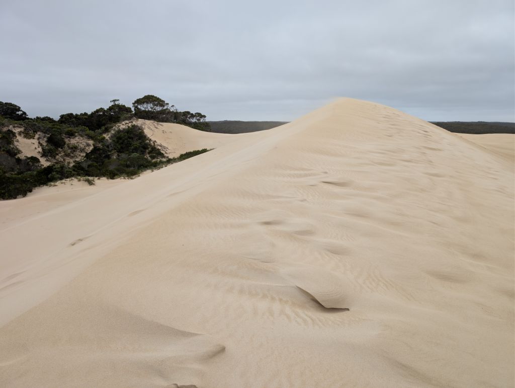 Auf dem Weg vom Parkplatz zum Büro entdeckte ich einen Koala. Am Büro muss man endlos lange Bedingungen unterschreiben, darf dann aber kostenlos und auf eigene Faust los. Die Dünen sind wirklich spektakulär. Da es sehr windig war und überall Sand aufgewirbelt wurde, traute ich mich nicht mit der echten Kamera zu fotografieren und machte nur ein paar Handybilder.