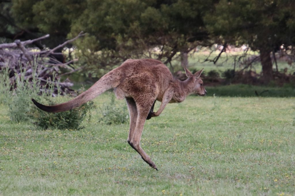 Vor dem Abendessen drehten wir eine Runde über den Campingplatz in der Hoffnung Kängurus zu finden. Und wir waren ziemlich erfolgreich. Auf einer Wiese waren jede Menge Kängurus unterwegs. Außerhalb des Campingplatzes waren noch mehr. Dazwischen entdeckten wir in der Ferne auch einige Emus.