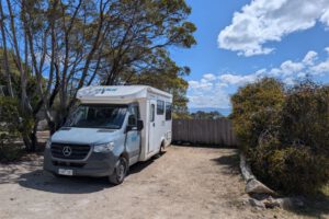 Auf dem letzten Stück, wo zuvor die Wale aufgetaucht waren, hatten wir immer abwechselnd die Augen vor unseren Füßen um nicht zu stolpern und auf dem Meer. Wale fanden wir aber keine mehr. Auf dem Parkplatz aßen wir noch zu Mittag und fuhren dann zu unserem nächsten Campingplatz in Coles Bay direkt am Freycinet National Park.