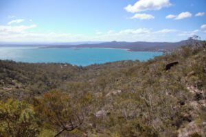 Zum Wineglass Bay Lookout führen auf dem ersten Stück zwei Wege. Mein gpx-Track für die morgige Wanderung läuft über den linken Weg. Da vor Ort der rechte ausgeschildert ist, wählten wir diesen. Um diese Tageszeit war auch nicht mehr allzu viel los. Der Weg führte zunächst durch den Wald bergauf. Nach den ersten Stufen wurde es etwas offener und wir kamen zum Coles Bay Lookout.
