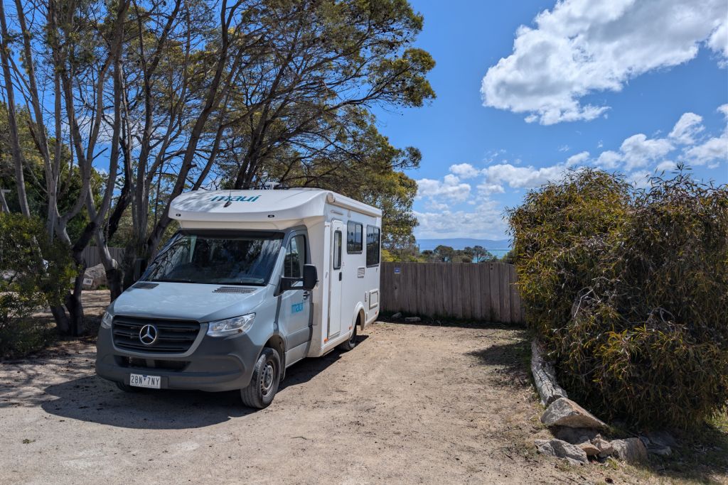 Unser Stellplatz selbst ist gar nicht so schlecht. Er liegt viel höher als die meisten anderen. Durch die Bretterwand sehen wir die anderen Camper weiter unten kaum und darüber haben wir sogar etwas Meerblick. Links und rechts trennen uns Bäume und Hecken von den Nachbarn.