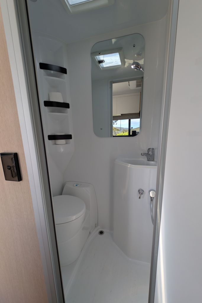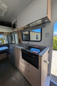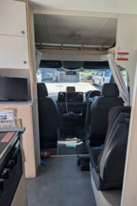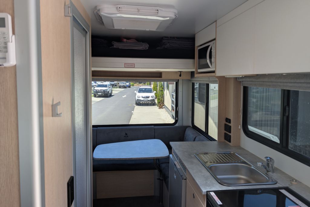 In Hobart tankten wir und fuhren dann zu unserem Campingplatz, auf dem wir eine Cabin für die letzte Nacht gebucht hatten. Wir hatten extra vor ein paar Tagen dort angerufen, um zu klären, dass wir unser Wohnmobil kurz an der Cabin parken können, um auszuladen, dass wir noch unsere WC-Kassette leeren dürfen, obwohl wir ja keinen Stellplatz gebucht haben und dass wir Gas auffüllen können. Deshalb waren wir ziemlich sauer, als das mit dem Gas plötzlich doch nicht ging. Es geht wohl manchmal und manchmal nicht. Aber warum hat man uns das bei dem Anruf nicht gesagt? Immerhin nannte man uns einen Campingladen 5 Minuten entfernt, wo man seine Gasflasche auffüllen lassen kann. Und obwohl wir etwas vor der offiziellen Check-in Zeit ankamen, sorgte man dafür, dass wir schon in unsere Cabin konnten. Nachdem wir alles ausgepackt und die WC-Kassette geleert hatten, machten wir noch schnell ein paar Bilder von der Inneneinrichtung unseres Wohnmobils.