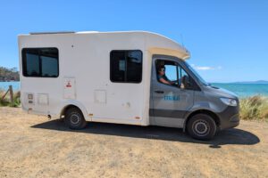 Wir bekamen noch den Preis für die Batterien ersetzt, die wir für die Fernbedienung der Klimaanlage nachkaufen mussten. Dann ging der Herr kurz mit uns ans Wohnmobil. Er fragte, ob wir Gas aufgefüllt hätten. Wir erklärten ihm, dass wir das getan hätten, aber dass die Ventile eventuell nicht in der richtigen Position seien. Er hatte keine Ahnung, wie sie sein müssen, meinte aber, das würde bei der Wartung vor der nächsten Vermietung geprüft. Er hob kurz die WC-Kassette an, um zu prüfen, ob sie leer war, und startete den Motor, um zu checken, ob der Tank voll war. Danach inspizierte er die Außenseite sehr flüchtig und machte mit einem Tablet ein paar schnelle Fotos, auf denen man sicher nicht viel erkennen kann. Ins Wohnmobil warf er nur aus der Fahrerkabine einen Blick. Hinein ging er nicht. Campingstühle und -tisch sowie Bettwäsche und Handtücher konnten wir auch einfach drin lassen. Das ging tatsächlich alles viel schneller und unkomplizierter als sonst. Sehr angenehm war auch, dass wir kein Gepäck hatten, auf das wir aufpassen mussten, da das ja alles schon in unserer Cabin war.