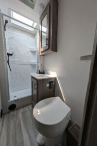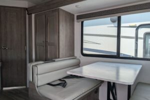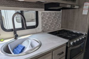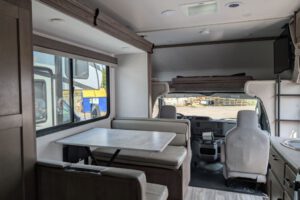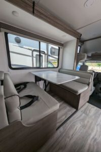 Obwohl wir kein Modell mit Slide-Out gebucht hatten, bekamen wir ein solches. Zunächst waren wir darüber gar nicht so glücklich, weil wir dachten, man müsste den Slide-Out zum Schlafen immer ausfahren. Das hätte auf manchen Campingplätzen zu einem Problem werden können, da wir bei der Buchung oft angeben mussten, ob unser Wohnmobil ein Slide-Out hat oder nicht. Nachdem man uns aber gezeigt hatte, dass das Ausfahren nicht unbedingt nötig ist, waren wir beruhigt. Leider mussten wir noch ein paar Dinge monieren. Ein Haken für die Leiter zum Alkoven hing z.B. lose herunter. Da hätte man keine Leiter einhängen können. Außerdem ließ sich einer der Staukästen außen nicht richtig schließen. Nachdem die Probleme halbwegs behoben waren, konnten wir endlich aufbrechen.