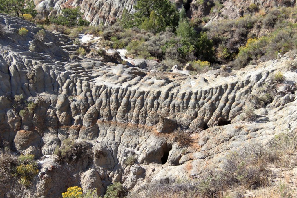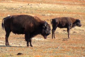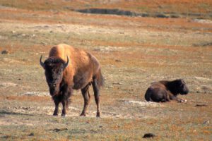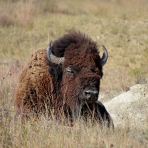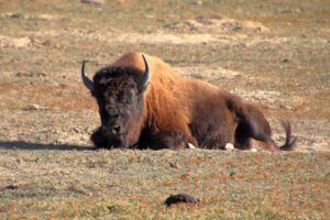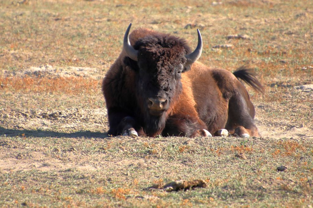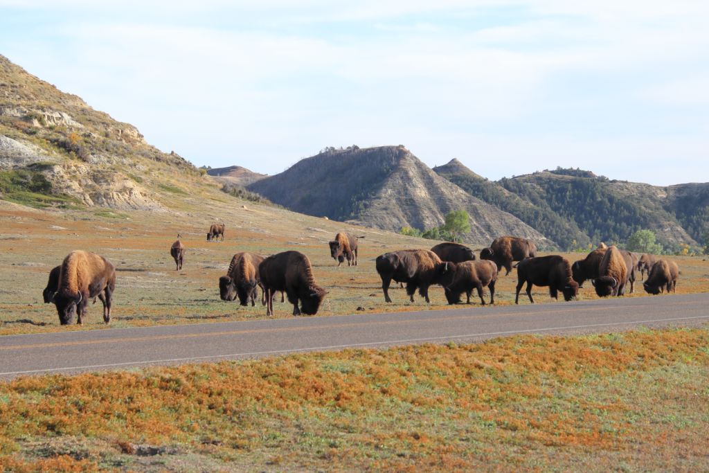 Auf dem Weg hatten wir schon eine ganze Weile die typischen kleinen Hügel gesehen. Im Park ging es so weiter. Und kaum waren wir an der Entrance Station vorbei, stand auch schon der erste Bison neben der Straße. Ein paar Kilometer weiter graste eine ganze Herde auf beiden Straßenseiten. Leider gibt es auf dem Scenic Drive, der eigentlich ein Loop ist, aktuell eine Baustelle, sodass man hin und zurück fahren muss. Da bei den Bisons sehr viel Gewusel war, beschlossen wir erst auf dem Rückweg zu halten. Natürlich in der Hoffnung, dass sie bis dahin noch da sind.
