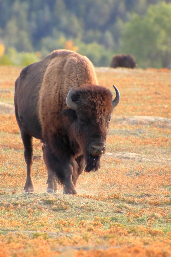 Die Bisons waren erst ziemlich weit von uns entfernt, bewegten sich aber langsam in unsere Richtung. Leider schien das Grünzeug direkt am Straßenrand am besten zu schmecken, sodass Fotos ohne Straße fast unmöglich waren.