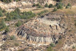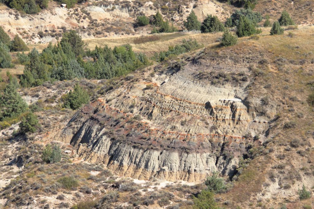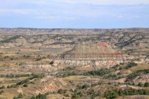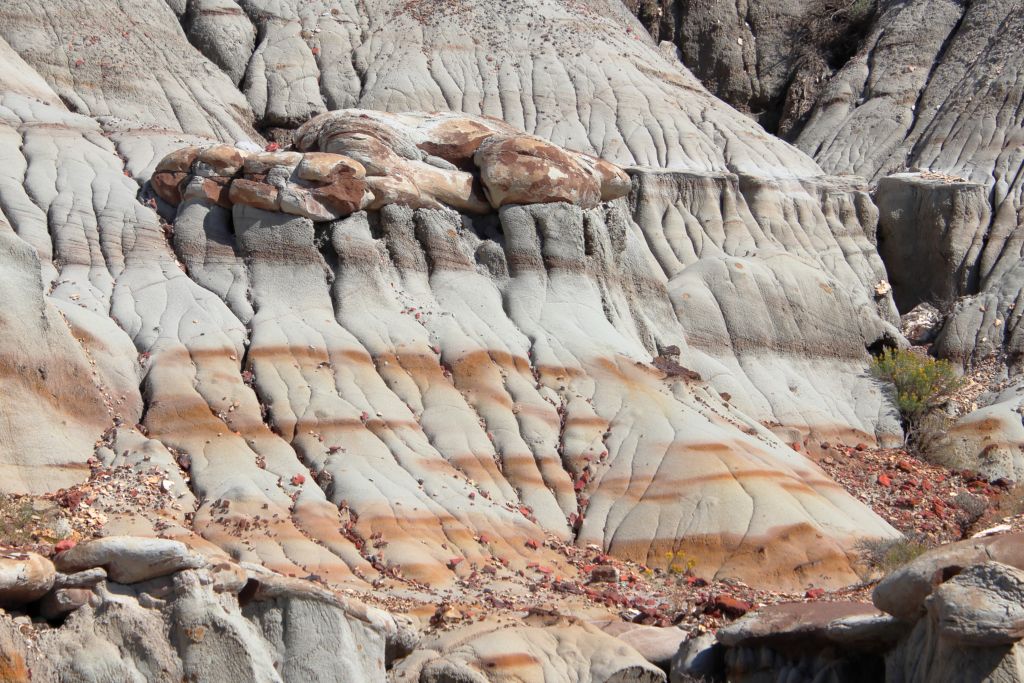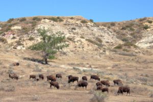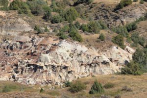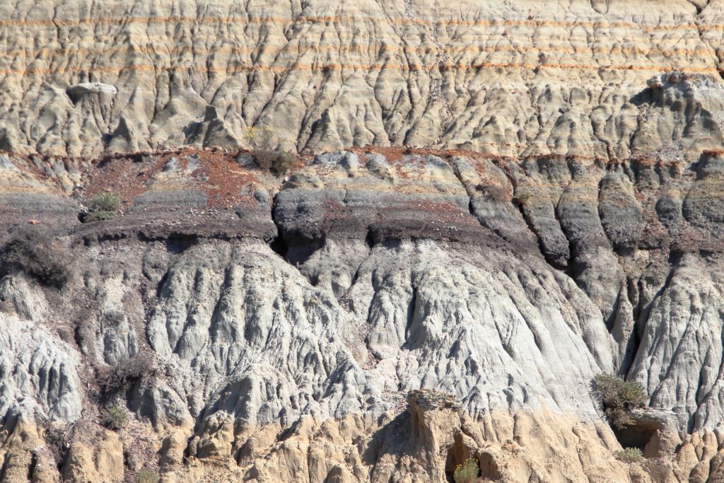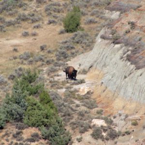Nur schnell vom Aussichtpunkt einen Blick auf den Painted Canyon zu werfen reichte uns nicht. Wir hatten noch eine Wanderung in den Canyon geplant. Zunächst ging es ein Stück am Rand entlang. Dann stiegen wir steil hinab. Die bunten Felsen aus der Nähe zu sehen, war ganz nett. Besonders gut gefiel uns, dass wir auf der ganzen Wanderung fast keine anderen Menschen trafen. Auf dem Rückweg beim Aufstieg gerieten wir bei ca. 30 Grad und strahlend blauem Himmel ganz schön ins Schwitzen. Bei einem Blick zurück sahen wir dann zwischen den Hügeln in der Ferne noch einen Bison.