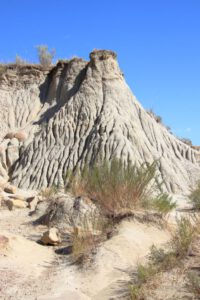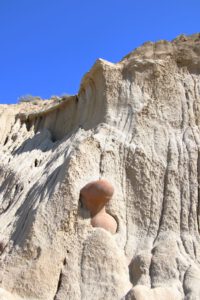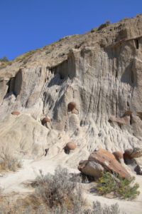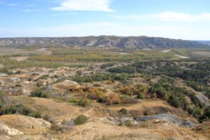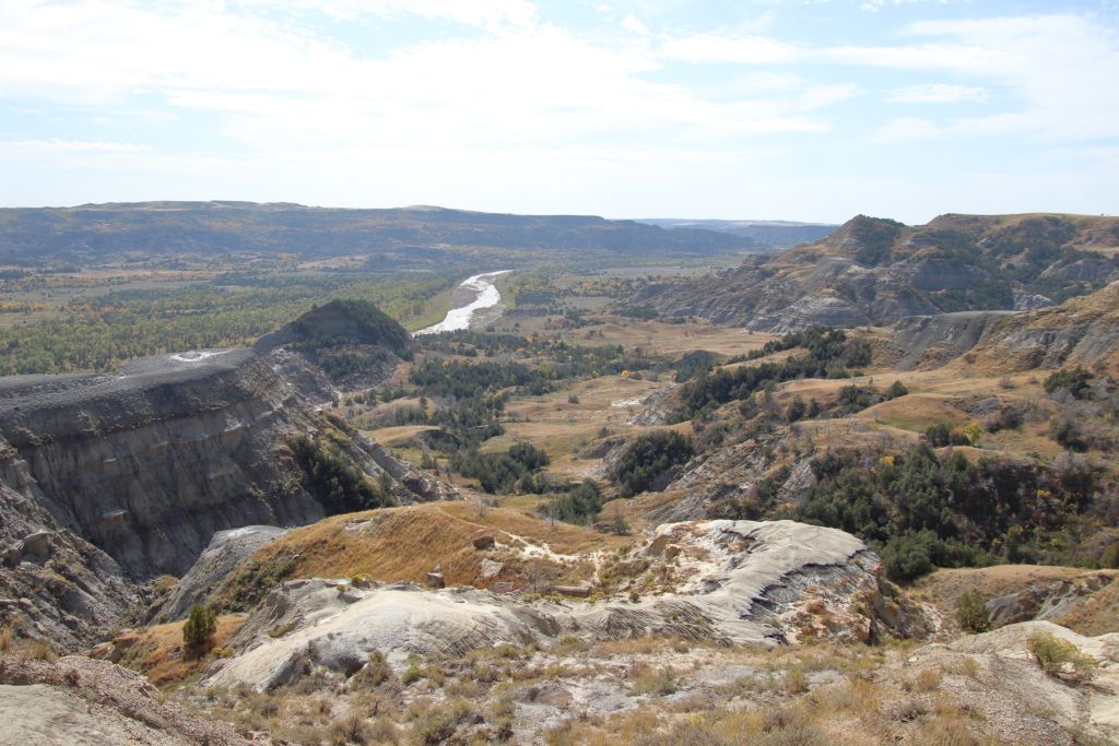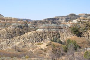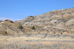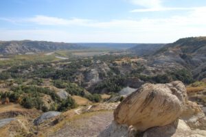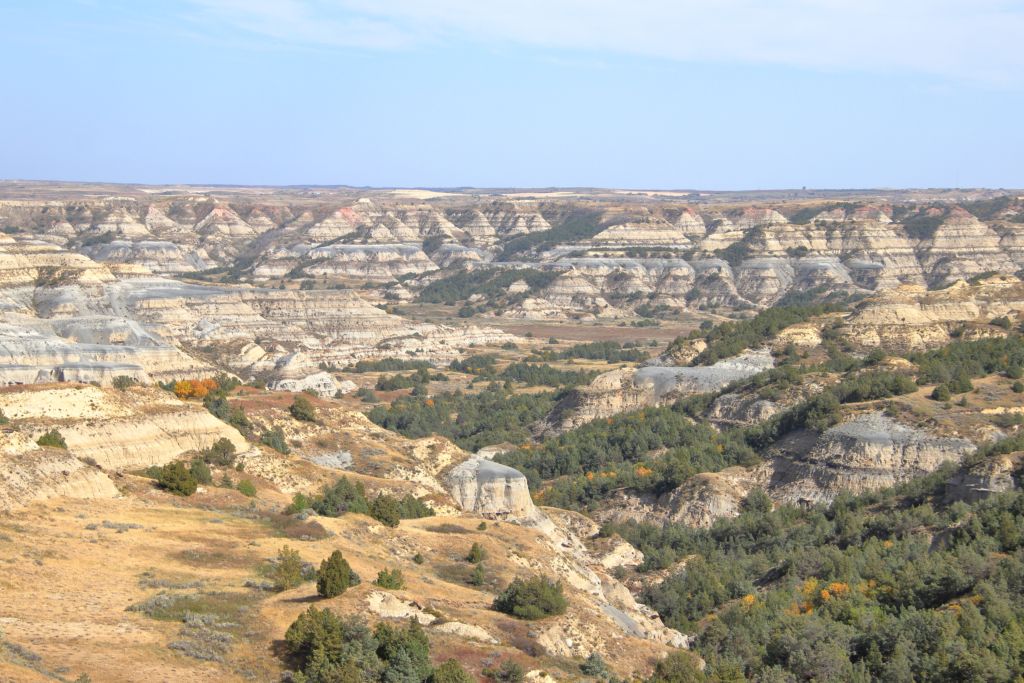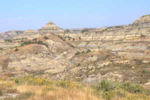 Da wir aktuell nichts weiter tun können außer auf Antwort zu hoffen, entschieden wir trotz der späten Uhrzeit noch in die North Unit zu fahren. Wir wollen wenigstens ein paar Aussichtspunkte am Scenic Drive abklappern, wenn wir schon nicht die geplante längere Wanderung, den Caprock Coulee Trail, machen können. Die Fahrt in den Nordteil zog sich sehr, da wir nur an eintöniger Graslandschaft vorbeifuhren. Kurz vor dem Park wurde die Landschaft interessanter. Gleich auf den ersten Metern im Park waren die Aussichten dann schon sehr schön.