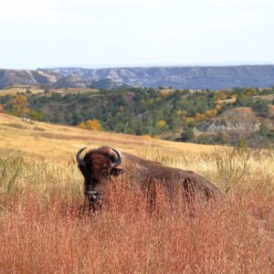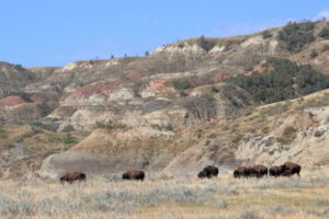 Auch die weiteren Aussichtspunkte überzeugten uns weit mehr als die im Süden des Parks. Am River Bend Overlook hatten wir eine wunderbare Aussicht auf den Little Missouri River, an dessen Ufer eine Herde Bisons unterwegs war.
