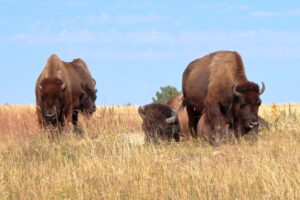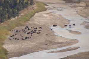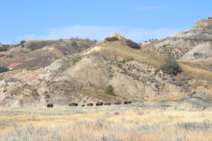 Als wir gerade vom ersten Aussichtspunkt aufbrechen wollten, sahen wir in der Ferne eine Herde Bisons einen Hügel hinunter kommen. Natürlich blieben wir noch etwas. Zu Fuß gingen wir ein Stück die Straße entlang, um ihnen etwas näher zu kommen.