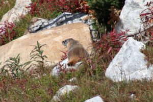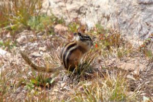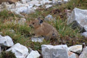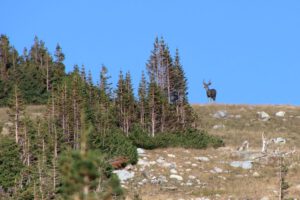 Unsere ersten kleinen Tiere sahen wir auch schon auf der Wanderung: Streifenhörnchen, Murmeltiere und Pikas. Sie waren aber sehr scheu, sodass wir sie kaum fotografieren konnten. Kurz bevor wir den Campingplatz erreichten, kam die Sonne wieder heraus und wir entdeckten in der Ferne Maultierhirsche.