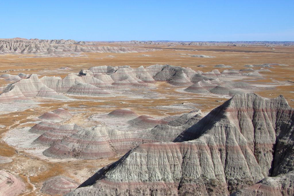 Da unser Navi uns nochmal über die eine Hälfte der Badlands Loop Road schickte, legten wir noch einen ganz kurzen Stopp am Big Badlands Overlook ein. Wir hatten ihn ja bei Ankunft nachmittags besucht und wollten jetzt noch kurz checken, wie er im morgendlichen Licht aussieht. Die schöne linke Seite war wie erwartet jetzt im Gegenlicht. Dafür konnten wir diesmal aber die rechte Seite besser sehen.