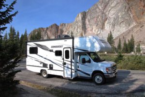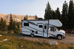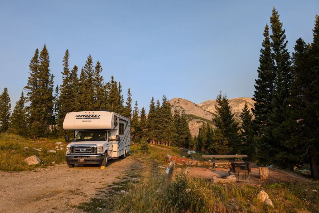 Wir hatten eine sternenklare und eiskalte Nacht. Leider haben wir kein Thermometer, aber viel über dem Gefrierpunkt können die Temperaturen nicht gelegen haben. Mit dicken Socken und Pulli ließ sich die Nacht ganz gut aushalten, aber morgens beim Aufstehen war es echt ungemütlich, zumal wir auf einem Campingplatz ohne Strom waren und daher die Heizung nicht nutzen konnten. Für die Kälte entschädigt wurden wir aber durch eine wunderbare Aussicht beim Frühstück. Die Sonne strahlte zunächst die Berge auf der einen Seite an und schaffte es dann auch über die Bäume auf der anderen Seite. Nach dem Frühstück musste ich einfach noch eine Fotosession von unserem Wohnmobil an diesem schönen Platz machen.