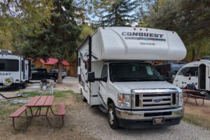 Unser Campingplatz am Snake River ist super eng und aus der offenen Tür des Nachbarwohnwagens begrüßte uns direkt ein Hund, der uns nicht geheuer war. Zum Glück brachte ein Mitarbeiter des Campingplatzes die Besitzer wenigstens dazu das Fliegengitter zu schließen. Offiziell müssen Hunde auf dem Campingplatz angeleint oder im Wohnwagen/Wohnmobil sein. Keine Ahnung, warum man nicht härter durchgreift, wenn man schon extra solche Regeln aufstellt.